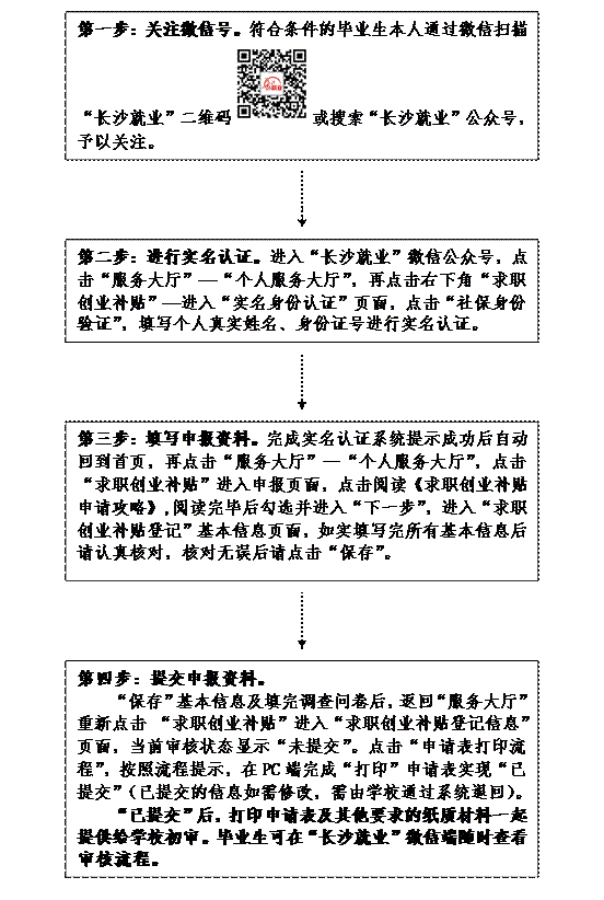 2018年9月30日前,符合条件的毕业生本人可通过关注“长沙就业”微信公众号,进入“个人服务大厅”里先进行实名身份认证,然后在“个人服务大厅——求职创业补贴”页面填报并提交申请(提交的申请信息将上传至长沙市就业专项资金网上申报系统对应的学校初审端)。