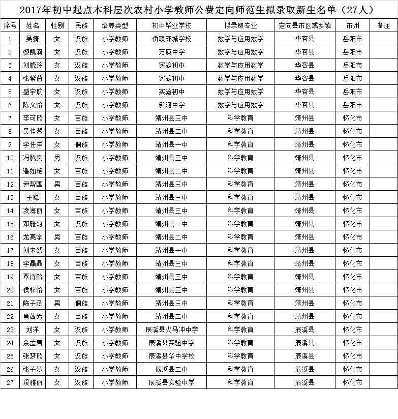 附件:2017年初中起点本科层次农村小学教师公费定向师范生拟录取新生名单(27人)